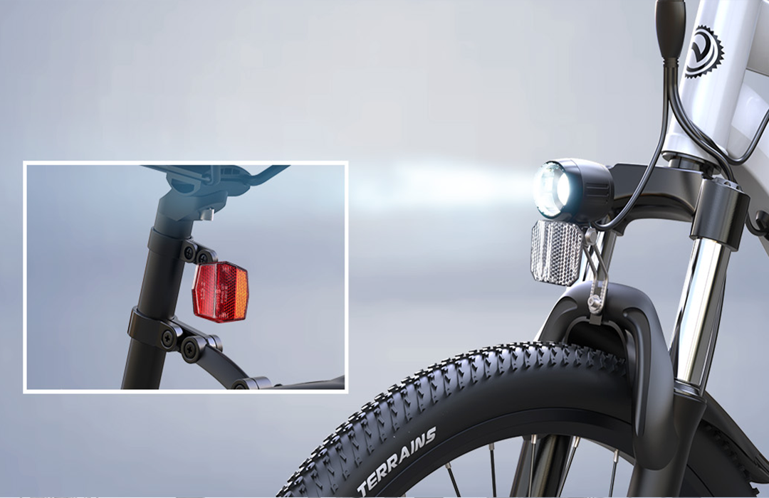 Nuestra bicicleta eléctrica está equipada con luces delanteras y traseras LED de alto rendimiento para garantizar una conducción nocturna segura. La luz delantera ultrabrillante proporciona una visibilidad excepcional, mientras que la luz trasera integrada te permite verte claramente desde atrás.
