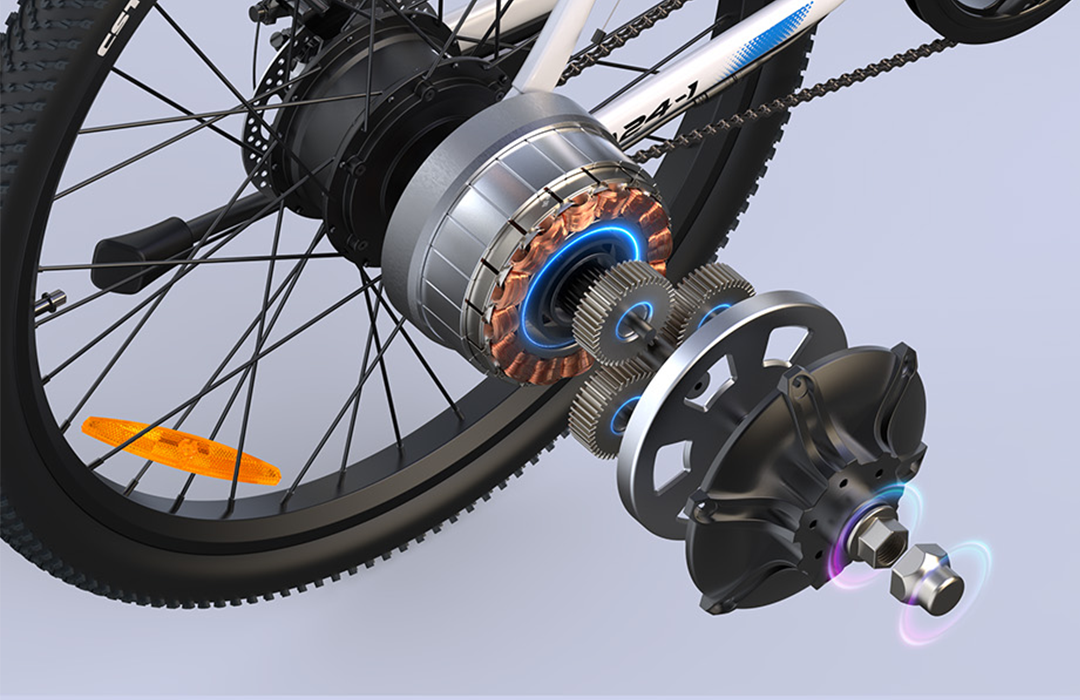 Impulsada por un motor sin escobillas de alta eficiencia de 250 W, esta bicicleta eléctrica de 24" ofrece un excepcional par motor de 40 N·m para una aceleración sin esfuerzo y una conducción segura en pendientes. El silencioso motor alcanza una eficiencia de conversión de energía del 95 % y ofrece tres modos de conducción intuitivos (eléctrico, asistido y pedaleado).