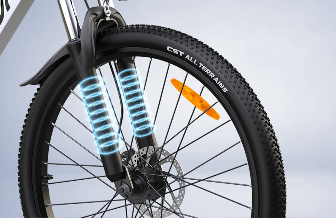 Nuestra bicicleta eléctrica cuenta con una horquilla de suspensión bloqueable de alta calidad que ofrece una amortiguación suave en terrenos difíciles. El sistema ajustable reduce las vibraciones y mantiene la eficiencia en carreteras asfaltadas cuando está bloqueado.